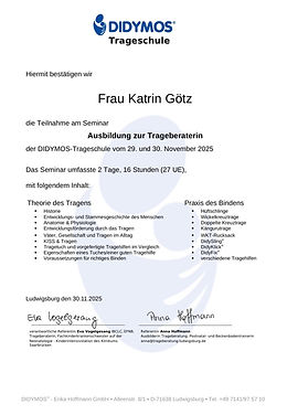 Ich bin zertifizierte und geprüfte Didymos-Trageberaterin. In meiner Ausbildung habe ich umfassendes Wissen über ergonomisches Babytragen, verschiedene Tragesysteme sowie die sichere und komfortable Anwendung erlernt. In meinen Beratungen unterstütze ich dich individuell dabei, die optimale Tragehilfe oder Bindeweise für dich und dein Baby zu finden.